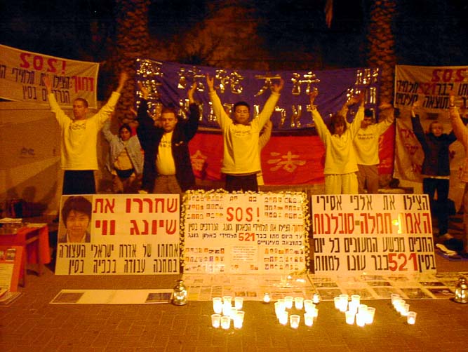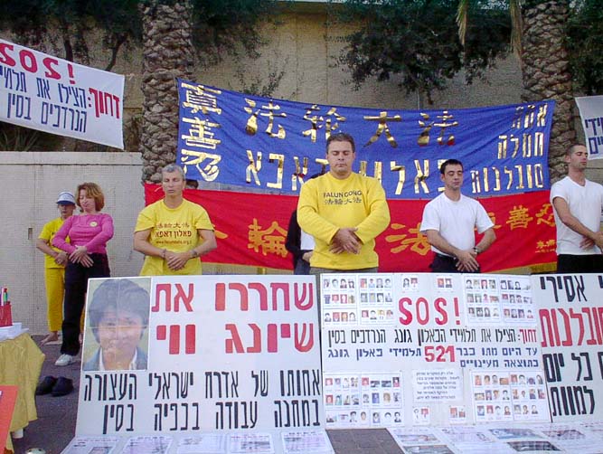 【明慧网2002年12月10日】以色列学员在周末2002年12月6日至8日连续三天58个小时在中使馆抗议对法轮功的镇压,营救熊伟。12月8号恰好是熊伟的32岁生日,以色列学员对因坚持真理而身陷劳改营里的同修熊伟给予祝福。