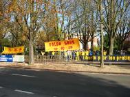 法轮功”、“法轮大法”横幅的小货车从使馆出发在布鲁塞尔市内来回行驶着。
