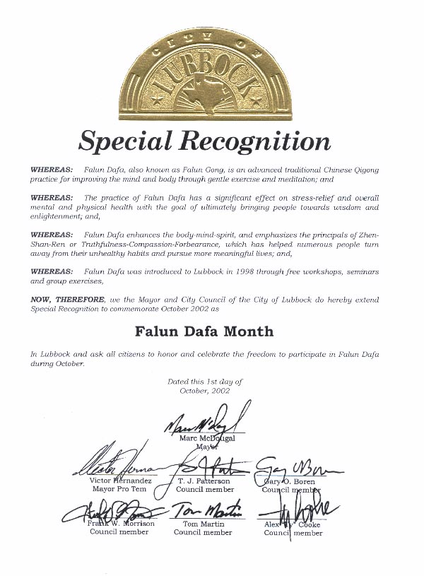 因此,现在,我们,路伯克市(Lubbock)市长及市议会,谨在此颁发特别褒奖,宣布2002年10月为路伯克市法轮大法月,同时邀请全体市民在法轮大法月期间参加活动并颂扬修炼法轮大法的自由。