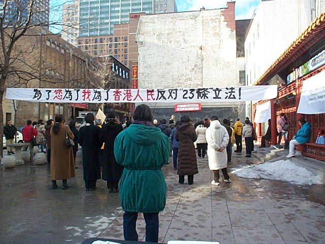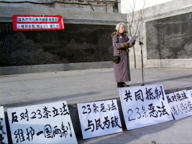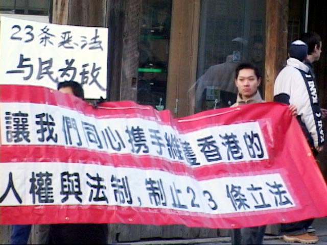 在游行队伍中,记者看到了在中国大陆因不畏强权、坚持信仰、而被非法监禁达两年之久的法轮功修炼者林慎立先生,林先生指出,23条其实就是中国江XX对法轮功的迫害到了香港的翻版。他说:“因为中国是集权统治,在香港一国两制的情况下,它采用蒙蔽百姓的方式,通过法律手段制定23条,表面说得冠冕堂皇,什么‘叛国,分裂… ’其实它的内涵是什么,它不敢公布出来,不敢用白色草案立法。其实它的内涵就是压制、迫害那些在政府做错事时敢于出来主持正义的人,敢于说真话的人。对于23条立法,我觉得香港人民面对的问题也就是我们法轮功学员在大陆面对的问题,如果不阻止23条立法,结果必然是这样的。”