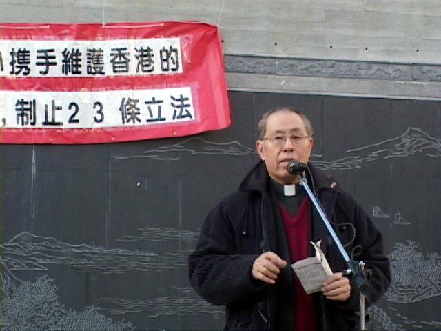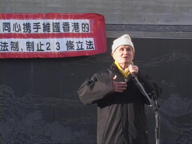 | 天主堂尹神父在集会上发言 | 老作家韩德光先生在集会上发言 | 反对23条立法的游行队伍 |