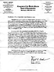 我在众议院任职期间,最关心的事项一贯是保护全球各地的基本人权。两年前,当我第一次听到中国政府[江氏集团]对法轮功的迫害时,我即刻就意识到这是极其不公正的,是我要帮助解决的。世界各地的法轮功学员坚持不懈地向他们的政府做工作,以确保此事得到各国政府应有的急切关注。为此,我始终相信,中国[江氏]政府对法轮功的镇压不久就会得到制止。