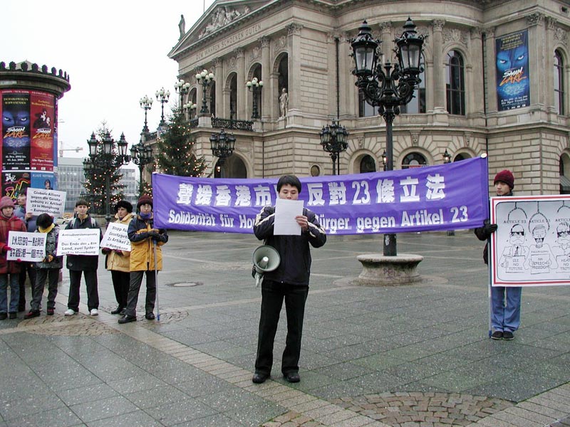 集会上还宣读了德国青年公职人员协会反对香港第23条立法草案的声明‘捍卫香港的人权’。声明中提到:德国青年公职人员协会支持欧洲议会最新的提案,维护香港的基本人权,并强烈要求香港特区政府遵守其在联合国有关经济、社会与文化权利公约以及公民与政治权利公约中的义务,并重新审核现有法律,使之与公约保持一致,而不是建立新罪名以国家安全的名义限制香港人民的自由。