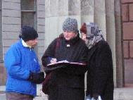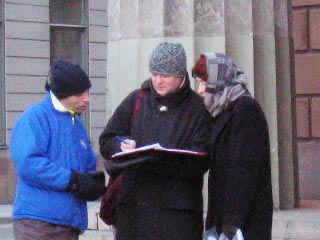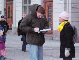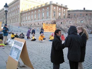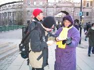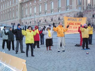 【明慧网2002年12月24日】2002年12月21日上午11点-下午15点,瑞典法轮功学员在首都斯德哥尔摩人流不息的议会广场(Mynttorget)举行了反对香港第23条立法的集会。醒目的“反对危害人权的香港第23条立法”横幅格外地引起了人们的注意。许多外出购买圣诞礼物的人们不由停下了脚步观看。当了解了真相后,他们纷纷对我们的活动表示支持,并在我们征集签名簿上留下自己的姓名。