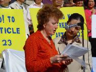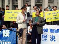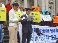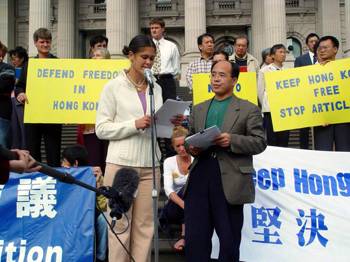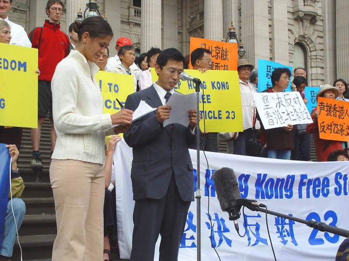商业界代表陈丽丽女士诉说到:“我是一个商人,去年我到香港、中国旅游,曾无辜地被中国海关整整关押了一天一夜。最近,我又准备去香港购置设备。如果23条立法一旦成立的话,那么我在中国大陆遭受的那噩梦般的经历就会在香港重演,为此我感到恐惧,所以我强烈地反对香港23条立法。我也希望每一位海外华人,在香港人民的人身自由面临巨大威胁之际能站出来,为维护香港的民主和自由说句公道话。”