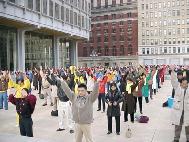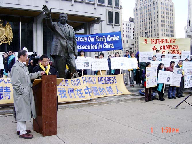 一点半,新闻发布会由美国“法轮功之友”协会主持,在费城市中心市政大楼旁边的托玛斯.培恩广场(Thomas Paine Plaza) 举行。