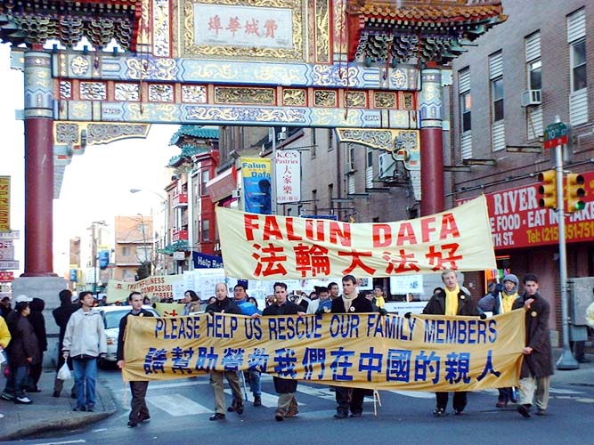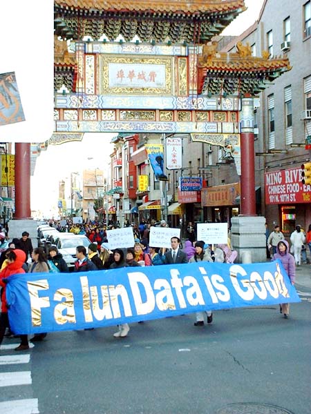 大法弟子的步行队伍平和,秩序井然,如此多人数的游行只有两个警察维持交通实属罕见。来自世界各地的大法弟子象一个坚不可摧的整体,展现了大法弟子的风貌。有些善良的中国人向步行队伍鼓掌,向学员了解真相。天气虽冷却是晴空万里,“法轮大法好”、“真善忍”、“向中国同胞问好”、“停止迫害法轮功学员”等横幅飘扬在空中。学员还为配合这次活动,在中国城及费城重要景点“自由钟”,这两个大陆旅游团必经之地设置了多面悬挂在道路两旁的“法轮大法”街边横幅,并在中国城放置展板,播放真相电视等,让人们进一步深入了解真相。