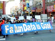 下午2点,法轮功学员打着“请帮助营救我们在中国的亲人”的大型横幅从市政大楼前出发,走过中国城。走在步行队伍最前面的是几十名在中国被迫害的法轮功学员的家属,他们胸前佩戴“请帮助营救我们的亲人”的绸带、向民众发出呼声。被迫害的亲人的姓名及照片,迫害的统计数据,以及“请您伸出援手,营救我们的亲人”的小展板在步行队伍中向人们展示江氏对法轮功学员迫害的这一不容置疑的事实。