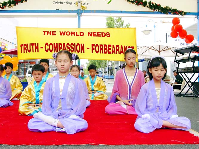 | 明慧学校的小弟子们在作五套功法演示 | 舞蹈 -- 唐装 | 男生小合唱 |