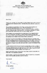 请放心,澳大利亚将继续在一切适当的机会敦促中国改善其对待法轮功的态度。