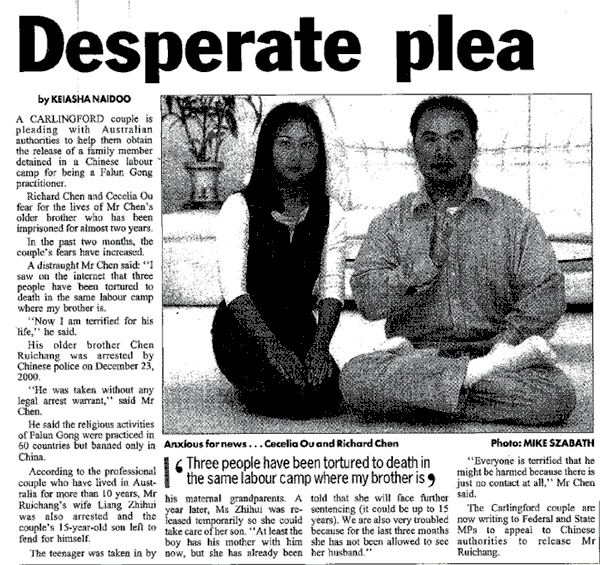 为了营救他的哥哥陈瑞昌,弟弟陈瑞钦(澳洲公民,工程师)上下奔走,多方呼吁。陈瑞钦所在的社区英文报纸,澳洲希尔山时报9月24日第三版对此事做了报导。联邦议员罗斯·卡麦隆先生(ROSS CAMERON ),在收到他的信后,即复信表示,已将陈瑞钦的呼吁转达给澳洲外交部长。