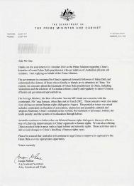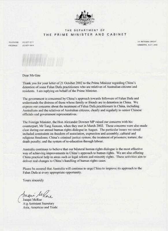 感谢您于2002年10月21日就中国[江氏集团]监禁澳大利亚公民和居民在中国修炼法轮功的亲属之事给总理的来信。我代表总理谨回此信。
