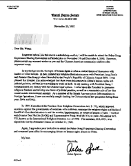 再次感谢你邀请我参加“法轮功修炼心得交流会”。我嘉奖你们为鼓励人们讨论中国[江氏集团]侵犯人权所做出的努力。