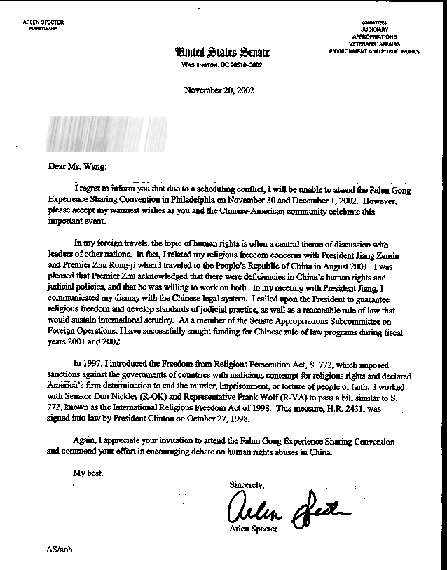 由于时间安排有冲突,很抱歉我不能够参加11月30日及12月1日在费城召开的法轮功修炼心得交流会。但是,当你和华人社区共庆这一重要活动时,请接受我最热烈的祝贺!