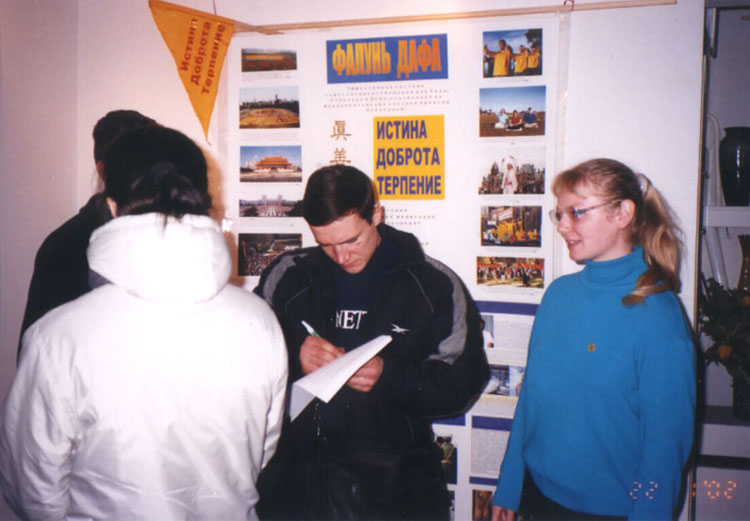 每天都有成百成百的观众前来观看画展。一个个学校老师带领孩子们来画展了解法轮功真相,纯洁天真的孩子们一看到学员们炼法轮功,他们就争先恐后跟着炼。他们个个争着拿法轮功资料。画展里放满了各种真相材料和正法之路的图片,学员们还放置了一台电视机在展厅里不断播放俄文的中国镇压法轮功真相。俄罗斯和乌克兰学员的不懈努力获得了很好的效果,成功的画展使众多媒体、政府和当地民众了解到了法轮功的真象。