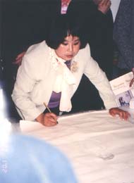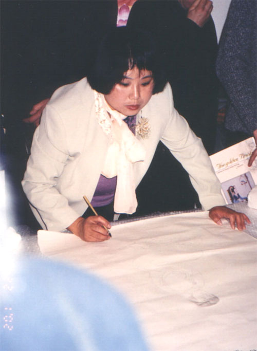 | 新的参观者不断地到来 | 一些被章翠英的绘画天才所倾倒的人拿走了她的“小传” | 这两天有很多人在声援遭受迫害的法轮功修炼者的签名簿上签上了自己的名字 |