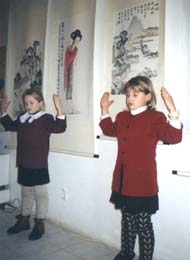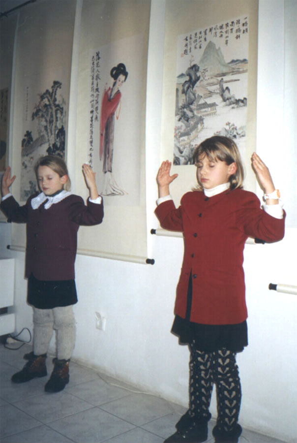 | 章翠英在画“发正念的女子” | 法轮功小弟子们在表演功法。 |