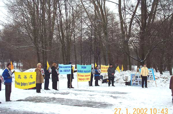 【明慧网2002年2月1日】2002年1月27日,圣彼得堡大法弟子来到莫斯科,与莫斯科大法弟子汇合后一起来到中国大使馆进行和平抗议活动。学员们打开写有“要求中国政府停止对法轮功学员的非法镇压”和“停止在俄罗斯对法轮功的造谣活动”的横幅,抗议期间学员们手里举着被中国当局折磨致死的同修们的照片。