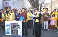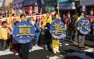 各种中英文“真、善、忍”和“法轮大法好”的横幅每当游行队伍停下来,学员们就表演功法,尽管组委会企图让我们快速通过主席台,我们还是停下来表演了第一套功法游行结束时,当地官员讲话。我们作了介绍并表示感谢。很显然,我们应该把参与当地社区的活动提高到一个新层次。