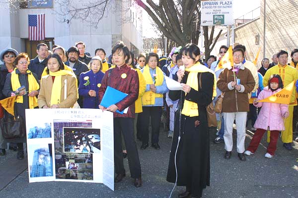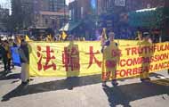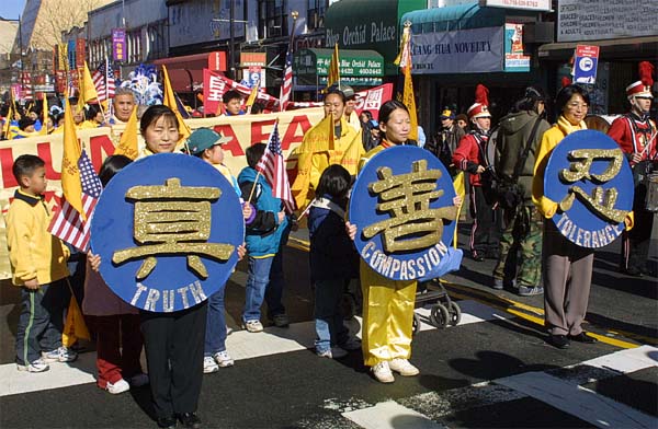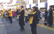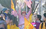 游行开始前的新闻发布会,澄清游行组委会企图阻挠法轮功参加游行的事实真相游行开始前,其他路过的团体索取支持法轮大法的徽章和小旗,并带着参加了游行由于组委会的阻挠,法轮功最后一个参加游行,结果每一个经过我们的团体都看到了我们的“真、善、忍”标志,听到了普度音乐。恶意的阻挠反倒成了我们弘扬大法的好机会。