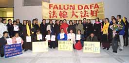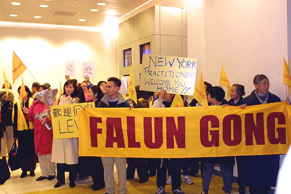 新闻发布会后,纽约地区的法轮功弟子们凭着强大的正念,与负责游行治安的109分局警官及筹委会交涉,在游行开始的最后一刻成功地加入游行的队伍,再一次向广大华人社区展示了法轮大法的美好。法轮功学员的队伍在“普度” “济世” 音乐的伴随下,举着“法轮大法好”,“世界需要和平 人类需要真善忍”的横幅,平和地行进,不时地向观众表演法轮功的功法。有多位西人和华人学员一路向观众发放法轮功的真相材料。许多华人为法轮功加油,有的华人说:“看到你们来了真高兴!”有的观众对中领馆无理阻扰法轮功学员参加游行表示极大的愤慨。有许多游行的非法轮功学员戴起了“我支持法轮功”的胸章。法轮功学员的游行队伍在祥和喜庆的气氛中走完了游行的全过程。至此,江泽民的中国政府在海外迫害法轮功的阴谋又一次彻底破产。