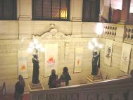 记者招待会地址就选在州府门前。恰巧当日有一个国会议员在州府门前发表演说,有很多官员参加,两位学员就邀请他们参加我们的凯旋欢迎会。那位国会议员亲眼看到学员步行经过时,感到很大震撼。一位州议员当即表示会亲自到会颁发褒奖并演讲。学员发现每家报纸、电台、电视台在州府内都有个办公室,于是就挨个告诉记者站我们活动的内容、目的,并邀请他们采访,起到了较好的讲清真相的作用。