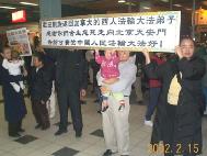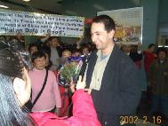 【明慧网2002年2月17日】140多名多伦多大法弟子今晚又来到了这熟悉的多伦多机场候机大厅,迎接当晚11:30将返回多伦多的两名参加天安门国际和平请愿的西人大法弟子归来。在机场候机大厅内,同修们手举刚刚赶制出的两面中英文展板,上面写着:“欢迎凯旋返回加拿大的西人大法弟子,感谢你们舍生忘死走向天安门,告诉可贵的中国人民“法轮大法好”。