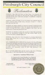 2月19日上午颁发仪式的会场庄严肃穆,决议发起人,市议员威廉.佩督图在仪式上正式宣读了议会决议后,法轮功学员发言向市议会致诚挚感谢并对中国目前仍在进行的无理疯狂迫害做了进一步的揭露。之后决议发起议员威廉.佩督图又再次发言,向其他在场议会成员及听众说明了在中国对于法轮功学员的多起虐杀行为也同样发生在了匹兹堡市的姐妹城市 -- 湖北省武汉市,他说道,“我理解姐妹城市的精神,但是基于人性的立场,我提议将我们今天的决议同时寄往武汉市,以此来表明我们对于此事件的态度。”此一提议被立即当场通过。