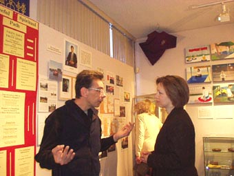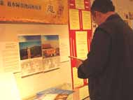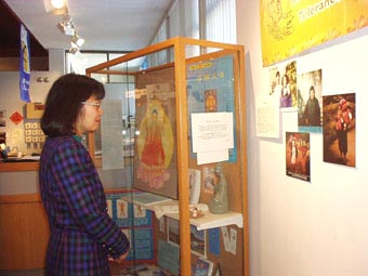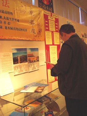 春节前夕,一次偶然的机会,一位学员得知渥太华尼品博物馆要举办“2002马年中国文化展”。于是与博物馆联系举办“法轮大法图片展”。馆长豪弗曼先生(Huffman)欣然同意为我们免费提供场地。经过几名学员夜以继日的辛勤准备,在大年初一,展览正式与人们见面了。这次展览的展品包括法轮大法正法之路的多幅图片,真相小册子,书签,不同语言版本的法轮大法书籍,锦旗,横幅,3位学员艺术家等等。一张张图片,一件件物品,向人们展示着法轮大法在世界各地的洪传与发展,来自世界50个国家的褒奖,在中国江集团残酷迫害法轮大法修炼者的黑暗日子里,海内外的大法修炼者们表现出的对大法坚如磐石的正念、正行。