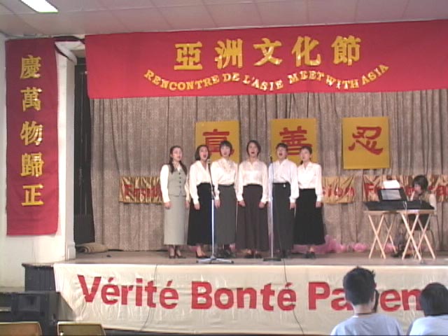 【明慧网2002年2月28日】二月十六日,蒙特利尔大法弟子与魁北克省成人教育中心联合举办了以“真、善、忍”为主题的亚洲文化节,内容包括“正法之路”图片展,大法弟子编排的舞台节目和东亚国家文化展览。
