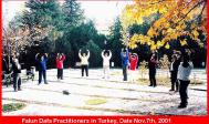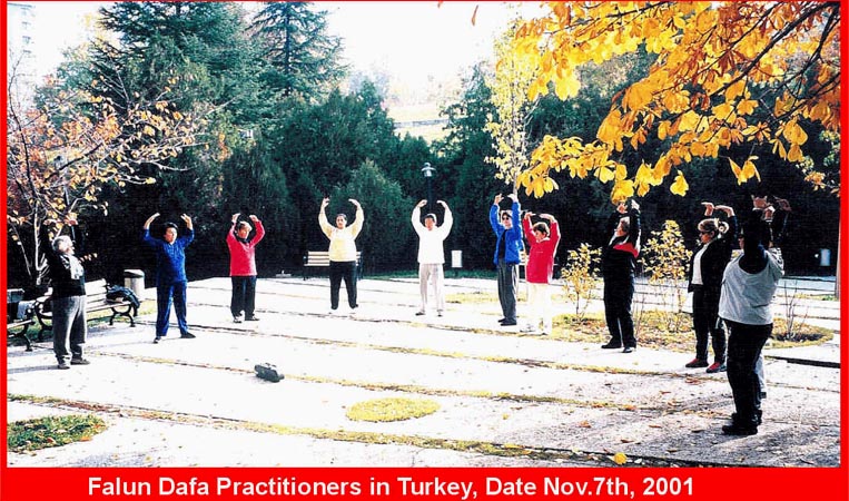 随附土耳其大法弟子2001年秋天在公园炼功时的照片。