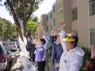 部分学员高举“真善忍”和“停止虐杀法轮功学员”的横幅,另一部分学员炼功、发正念。