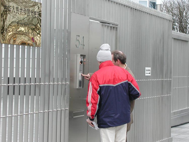 由于以往每天都有学员在使馆前请愿,所以警察对我们已很熟悉。我们刚把昨天赶制的呼吁停止枪击和判处法轮功学员死刑的德文横幅固定好,两个警察就笑容可掬地来到我们这里。我们告诉了他们关于长春电视台和江泽民的命令的最新消息,他们一方面为大陆学员的壮举感到高兴,另一方面又对江泽民的卑劣手段频频叹气摇头,并说如果在请愿活动中遇到麻烦随时可以叫他们,他们就在对面的车里。