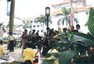时间一分一秒地逼近。13:00时,来了两个武装警察,随同两个大使馆官员。两个武警查询准则。警察看了准则,明白上司法令无法更改,便只要求我们提前解散。一心希望破坏我们请愿的大使馆官员看事不得逞,便无视印尼法律,到场叫嚣谩骂,完全忘了自己是外国人身份的中国大使馆官员。该中国使馆官员还命令身为印尼公民的法轮功学员:“马上给我撤退,你们的准则已被吊销,你们还敢坐在这?!”极为粗鲁无理。法轮功学员心怀“真、善、忍”,一正压百邪,任他在那里丑态百出。这个官员不但不知道自己的表演很丑恶,还竟然得意忘形,口出狂言:“不想想你们是什么人,胆敢跟中国政府斗。”我们现场一位印尼老年学员平心静气地回答:“我们是印尼公民,你无权干预印尼公民的事。(你要)记得呀,善有善报,恶有恶报。”