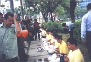 | 学员在中国大使馆前首次静坐请愿,电视、报纸等媒体到场采访 | 学员在任何时刻都能遵照师尊的教导,学法、发正念、讲清真相 |