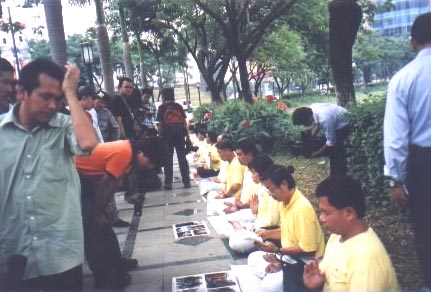 | 学员静坐、学法,吸引民众惊叹、称好 | 学员静坐发正念,路过民众与媒体正在注视中国残酷迫害法轮功学员的图片 |
