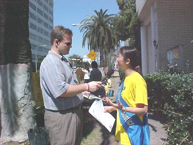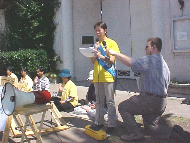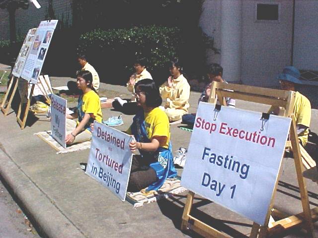 今天,我们大家聚集在这里,用自己的行动来表达对善良和正义的支持。我珍惜我的生命,爱护我的身体,但是在这场法西斯式的残酷迫害面前,我别无选择,必须站出来支持正义。我决定从今天开始进行一次为期四天的绝食行动。我希望我的付出能够唤醒千千万万颗在邪恶的迫害面前沉睡的心。对法轮功的迫害不仅仅是中国的事,因为法轮功修炼者的信仰是“真善忍”的理念。江泽民犯罪集团要在中国彻底灭绝“真善忍”精神,这是对世界上所有爱好和平的人民的犯罪。我请求美国政府和人民的帮助,立即制止中国的江泽民犯罪集团发布的屠杀令,尽早结束这场邪恶的,反人类的血腥迫害。