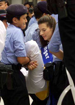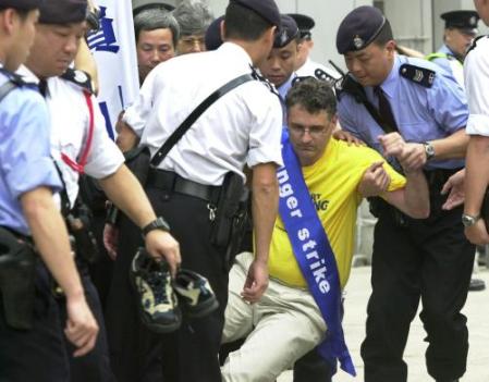 2002年3月14日,西蒙史雷格,一位来自瑞士的法轮功追随者在和其它三名瑞士法轮功修炼者于香港中联办外开始绝食后被警察扛走。星期四,该四人小组和当地修炼者举行抗议,敦促中国停止镇压这一被取缔的精神运动。(路透社/ Bobby Yip)