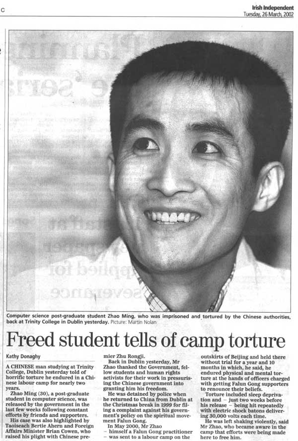 赵明于1999年圣诞假期从都柏林返回中国,为的是提交一份抗议书,反对中国(江泽民)政府对法轮功精神运动的政策,并因此被警察逮捕。