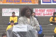 赛蒂.昆女士女士说:“今天我带着悲伤的心情在这儿为法轮大法修炼者在中国大陆失去人权所受迫害与虐杀,代表非政府组织提出严正抗议。”