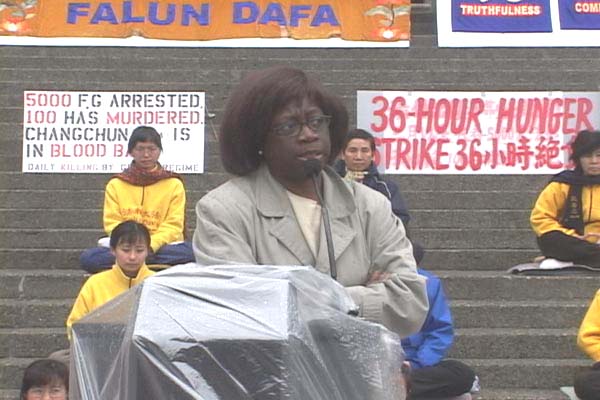 莎瑞.牟德女士代表四万六千名医院员工工会成员敦促加拿大政府要求中国政府尊重它在国际人权公约中所应履行的义务,并尊重法轮功学员为争取人权的奋斗,立刻停止对法轮大法修炼者的迫害。