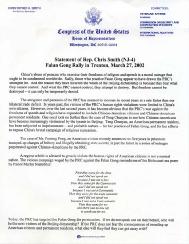 中国对于履行宗教和言论自由的人们的虐待是一种道德暴行,必须受到全世界的谴责。令人悲哀的是,修炼法轮功的民众似乎点燃了中共[江泽民政权]最激烈的怒火。北京的独裁政权之所以对这些人怒不可遏是因为他们惧怕他们无法控制的人。任何它无法控制的,它就要试图毁掉。然而,自由是无法摧毁的--它只能暂时地被剥夺。