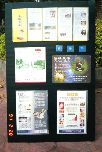 展板带到炼功点上时,同修们都睁大眼睛围过来看。36位西人学员在天安门前的照片(图一左上),吸引了大家的注意,我指照片的右后方请大家看:「后面好几个公安正快跑过来,这张照片差几秒就照不成了!」由于点上有新学员,我们便也提到天安门自焚是预先排演的一出戏,这张照片也证明天安门前公安这么多,真想自杀的人干嘛选去天安门自焚啊?一分钟内公安又哪来的灭火器呢?一位炼了两个月的同修便说:「他们以为别人都是笨蛋,这样也想骗人!」而1998年沈阳亚洲体育节万人法轮功表演的照片(图一中右),引起了大家的感叹:「中国大陆到1998年,一个开幕典礼都还那么多人在炼功哪!共产党竟然一下子就不给炼了!」「是啊!你看全世界都说大法好,连俄罗斯都那么多人修大法,中国大陆很快一定又可以炼!」另一位新学员看完SOS(图二)展板后说:「我知道中共在镇压,可是没想到他们这么残忍啊!这资料还有没有?我要再仔细看看!」