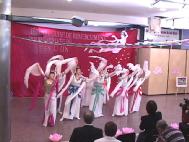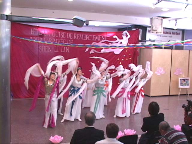 在来宾们品尝大法弟子们精心制作的中西佳肴期间,大法弟子表演了自编、自导的舞蹈《普度》、《飞天》,演唱了大法弟子创作的歌曲《跟您说句心里话》、《登归途》等。这些纯净的、发自内心的舞蹈和歌声感染了每一位在场的人。出席答谢会的观众中有许多是刚刚抵加的新移民和康蔻蒂大学的中国学生。