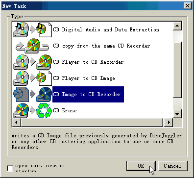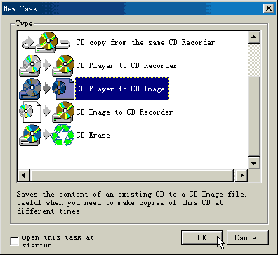 1、通过菜单中的“New”命令打开“New Task”窗口,选择“CD Image to Recorder”后点击“OK”:
