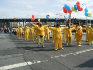 游行当日是一个晴天,温暖适中,和风习习。大法弟子身着金黄色炼功服在大法音乐的伴随下精神抖擞地走在游行队伍中。行人们都很受感染,纷纷接过大法传单。