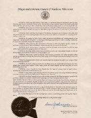 鉴此,威斯康星州麦迪森市市长和市议会特此决定,呼吁中华人民共和国政府(江泽民)立即停止迫害法轮功学员,解散遍布全中国的臭名昭著的“610”办公室,立即释放所有被拘禁的法轮功学员。
