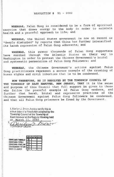 为此,新泽西州东汉诺威市议会决定:本议会全力支持那些以法轮功学员为和平典范的人们,谴责中国(江泽民)政府对法轮功学员的残酷镇压,呼吁释放所有被关押的法轮功学员。