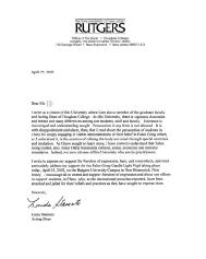 我以新泽西州立大学研究生分院的成员以及道格拉斯分院院长的名义给你回信。([就法轮功问题],本校学生及教职员工展开了一场别开生面的辩论。尽管大家有不同见解,但是都认为宽容和理解是应该的,不能允许任何形式的[对真善忍的]迫害。)在本校,学生和教职员来自不同的背景,常有激烈的讨论和辩论。我们鼓励大家容忍和寻找互相理解。任何形式的迫害是不允许的。当我得知那些中国学生,仅仅因为修炼法轮功就遭到迫害, 我感到很失望和震惊。我知道修炼法轮功可以通过特殊的运动和打坐使人身心得到升华。后来当我[对法轮功]有了更进一步的了解,我懂得了法轮功(又叫法轮大法)实际上超越于一切文化,社会,经济,国家与民族的范畴。事实上,在我们学校,就有法轮功修炼者。