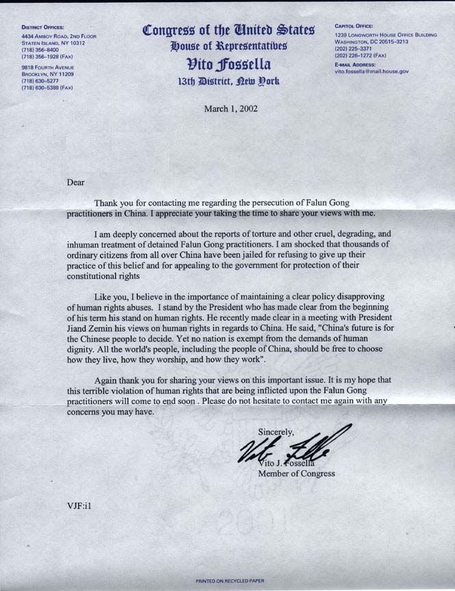 再次感谢您就此重要问题与我分享您的观点。我希望对法轮功学员人权的严重侵犯将很快结束。无论您有什么关心的事项,请不要犹豫再与我联系。